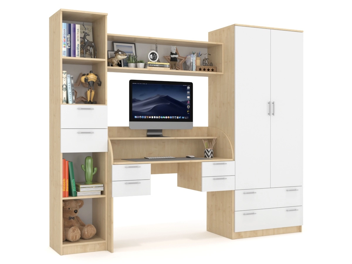 Детский гарнитур В гостях у сказки 14 - подойдет для комнаты ребенка школьного возраста. В комплект входит комбинированный узкий стеллаж для книг и игрушек, книжная полка, компьютерный стол с ящиками по бокам. Также гарнитур включает в себя шкаф с распашными дверцами и ящиками.