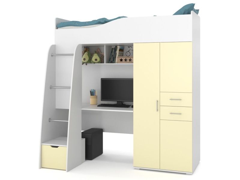 Детский гарнитур В гостях у сказки 9 – мебельный гарнитур в комнату ребенка. Он имеет красивую фотопечать с мультипликационными героями из мультфильма "Рио". Сверху находится спальное место. Подняться наверх можно с помощью лестницы. В лестнице есть небольшой шкафчик для хранения вещей. Также есть письменный стол с полкой вверху и просторный шкаф с выдвижными ящиками для вещей.