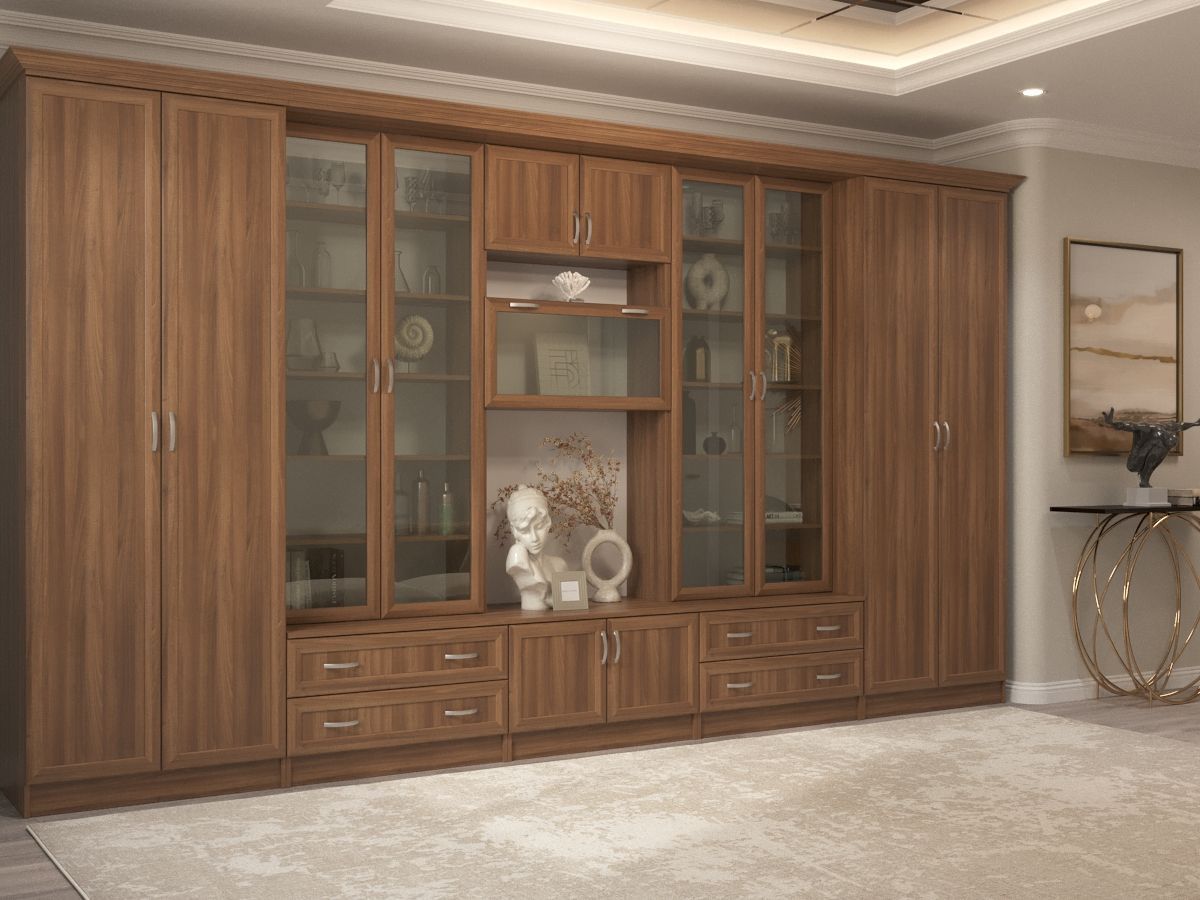 Стенка Виолета 2 (с витражным стеклом) несмотря на сдержанную лаконичную форму и близкую к классике цветовую гамму разбавлена яркими акцентами. Центральная секция отведена под аппаратуру и ТВ, от нее симметрично располагаются две секции, в двери которых вставлено витражное стекло, и два двухстворчатых распашных шкафа. Внутреннее наполнение предусматривает размещение большого количества полезных вещей, белья, одежды, аксессуаров и других предметов. Материал конструкции: МДФ с фрезеровкой по фасаду, витражное стекло, зеркало. Изменить цветовую гамму и заказать стенку Виолета 2 (с витражным стеклом) можно через форму на сайте в режиме онлайн.