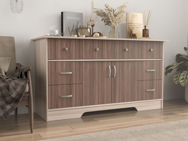 Комод Стенворд 14 выполнен в интересном, универсальном стиле, несомненно подойдёт к интерьеру вашего дома и будет гармонично сочетается с ним. Отличным решением будет разместить его в гардеробной, прихожей, или же спальне. Семь ящиков различного размера помогут решить вопрос с хранением вещей. За двумя дверцами имеется ещё один отсек для хранения абсолютно разных предметов, пледов, техники, книг и много другого.