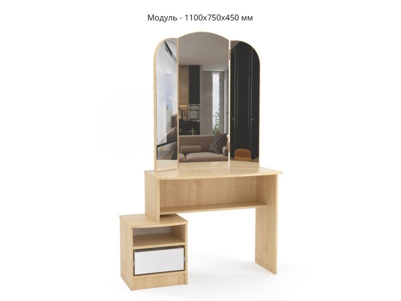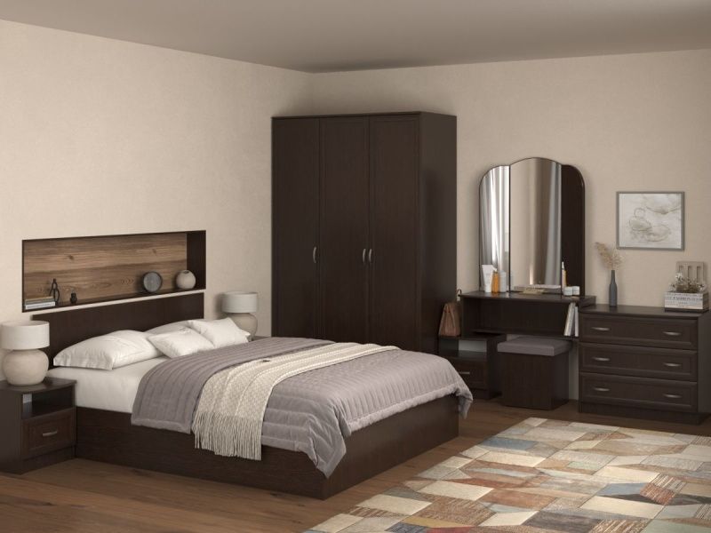 Спальный гарнитур «Елена 1.1» включает всю необходимую мебель для комфортного отдыха. В комплекте есть широкий шкаф, туалетный столик с зеркалом, тумбочки и комод.