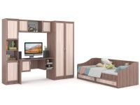 Детская стенка Калейдоскоп – привлекательная стенка. В центре расположен компьютерный стол. В комплектации платяной шкаф и пенал. Вещи можно развешивать и раскладывать на полках. Рамка по фасаду из МДФ представлена в цвете дуб молочный, однако можно подобрать другой.