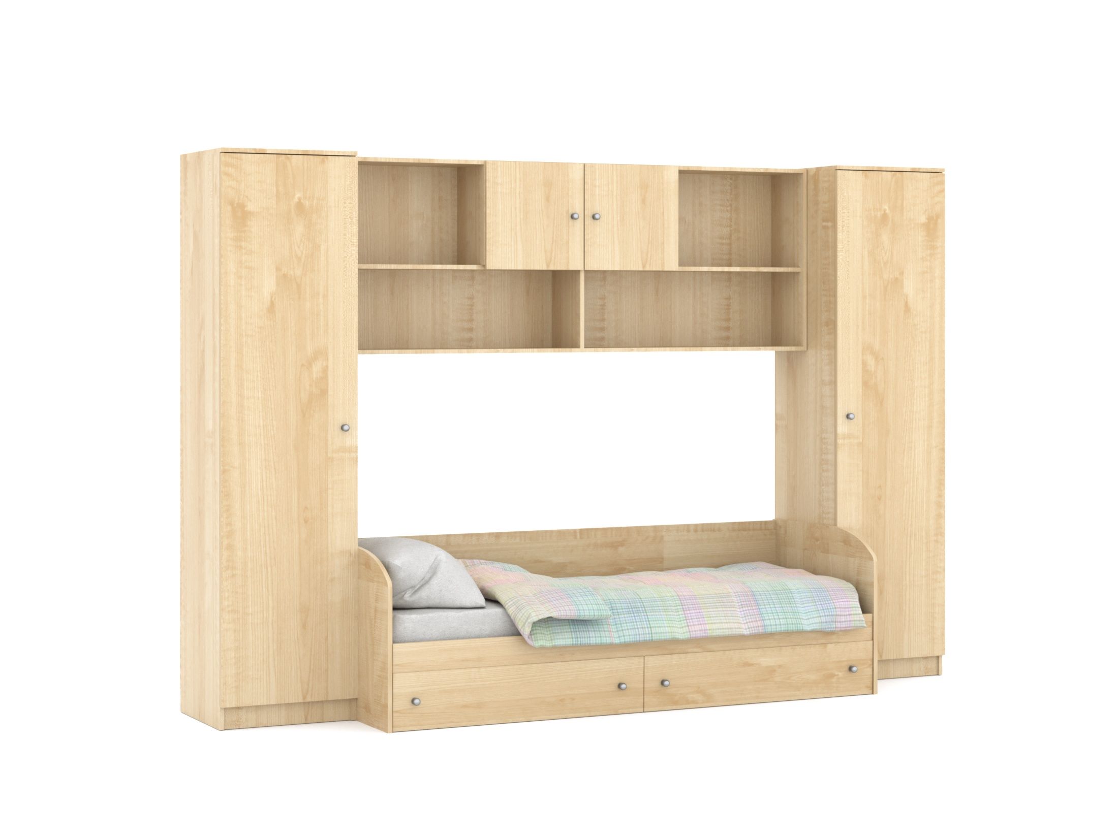 Детская стенка «Отличник 1+1» — лаконичный комплект мебели для комнаты ребенка или подростка. Стенка выполнена симметричной, смотрится очень гармонично. Слева и справа — однодверные шкафы. Между ними находится удобная кровать с выдвижными ящиками снизу и бортиками из ДСП с трех сторон. Над ней — полки открытого типа и спрятанные за дверцами. Гарнитур компактный и при этом практичный, позволяющий разместить множество вещей: одежду, игрушки, книги, сувениры и пр.
