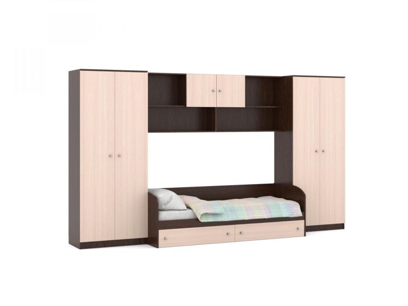 Детская стенка «Отличник 2+2» — вместительный гарнитур, отлично подходящий для меблировки личной комнаты ребенка любого пола. Комплект имеет симметричный дизайн, смотрится гармонично и стильно. Слева и справа находятся двухстворчатые распашные шкафы для хранения одежды и других вещей. По центру — спальная зона, представленная удобной кроватью с ящиками внизу и бортиками с трех сторон. Над ней — просторные полки для книг, игрушек и прочего, дополненные двумя отделениями с дверцами. Варианты цветового решения позволяют подобрать вариант стенки на свой вкус!