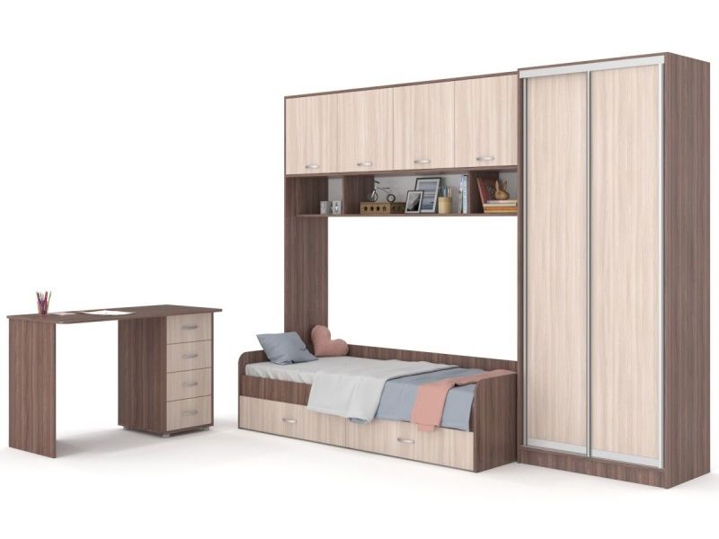 Детский гарнитур В гостях у сказки 24 – оригинальная стенка с письменным столом и спальным местом. В составе стенки есть двухдверный шкаф-купе, и навесные полки, письменный стол для учёбы. В кровати имеются ящики для белья и других вещей.