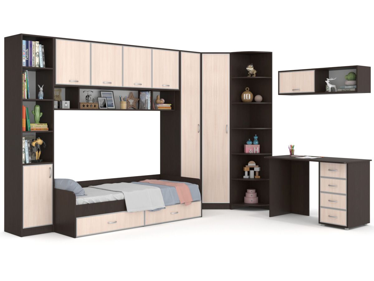 Детская стенка В гостях у сказки 5 – угловая модель мебели для спальной комнаты ребенка. Функциональна модель с множеством полок, шкафов, ящиков. В кровати два бельевых ящика, а над ней открытые полки и закрытые с откидными створками.