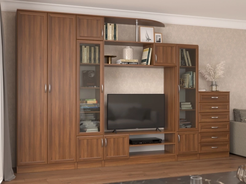 Классика в интерьерах жилых помещений всегда актуальна и удачно вписывается в любые решения. Стенка Алиса – идеальное решение для просторных гостиных, залов, спален и квартир-студий. Модель яркая и эффектная.