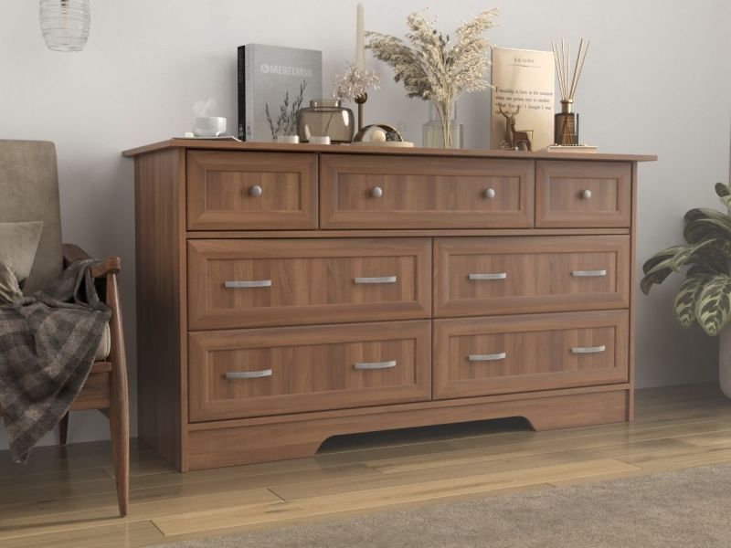 Комод Стенворд 7 - невысокий широкий комод может быть использован не только для хранения вещей, но и в качестве туалетного столика. Верхняя крышка комода может применяться как дополнительное место для хранения и организации предметов. Данный комод производит солидное впечатление в интерьере, придавая ему основательность и импозантность. В комод можно складывать вещи разного размера за счет вместительных ящиков. Правильно подобранный комод обязательно станет изюминкой интерьера и настоящим помощником в хозяйстве.