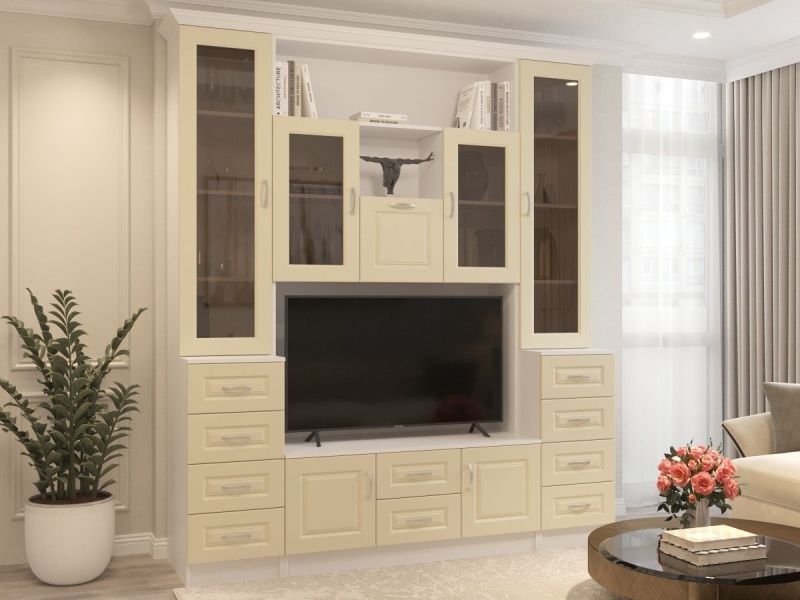 Стенка «Марина 6 МДФ» понравится ценителям классической мебели. В набор включены два шкафа-пенала и тумба под экран телевизора. Фасады изготовлены из МДФ премиум-класса с фрезеровкой. Стенка доступна для заказа в любом цвете, представленном на сайте.