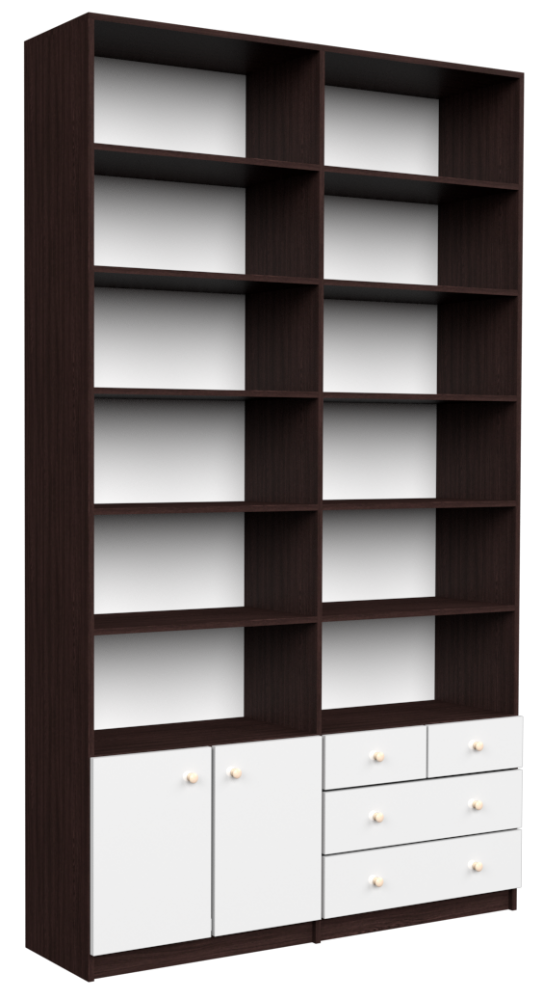 Книжный шкаф Марс 8 – простой и одновременно функциональный книжный шкаф. Он занимает большое свободное пространство по стене и смотрится достаточно стильно. В нем преобладают прямые линии. Элегантный книжный шкаф имеет в своем составе не только открытые полки, но и распашные шкафы, и выдвижные ящички.
