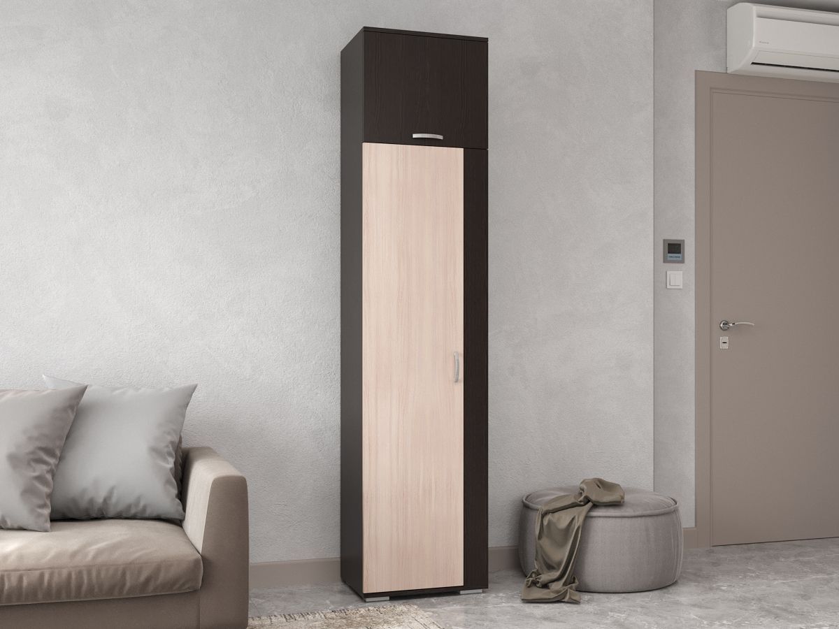 Шкаф платяной П-5 – актуальный пример соответствия мебели модным европейским трендам. В конструкции предусмотрено наличие полки и штанги для вешалок для размещения в гардеробе стандартного набора одежды. Особенность конструкции – наличие антресолей для хранения различных сезонных предметов гардероба. Тёмный цвет венге створок фасада мягко контрастирует с беленым дубом. Мебель отлично впишется в небольшую комнату малогабаритной квартиры, открытую студию, офисное помещение или спальню. При этом, шкаф визуально поднимет потолки, зрительно увеличивая пространство. Фасад изготовлен из практичных и надежных материалов на основе дерева. Фурнитура – плавно закрывающиеся механизмы. Купить современный Шкаф платяной П-5 недорого можно на нашем сайте в режиме онлайн.